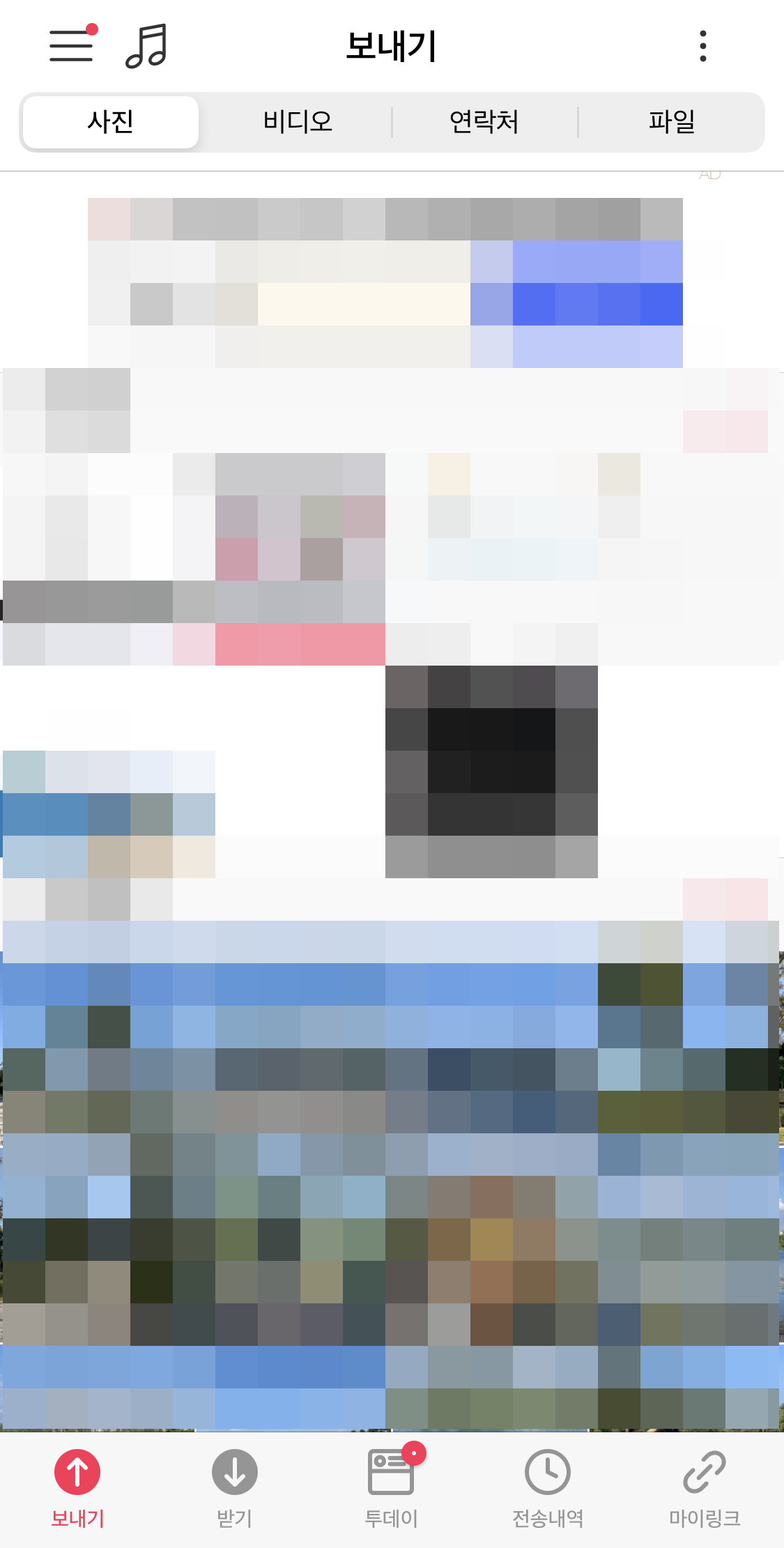 보내기 탭에서는 사진, 동영상,연락처, 파일 등에서 내가 보낼 파일들을 선택해서 보낼 수 있다.