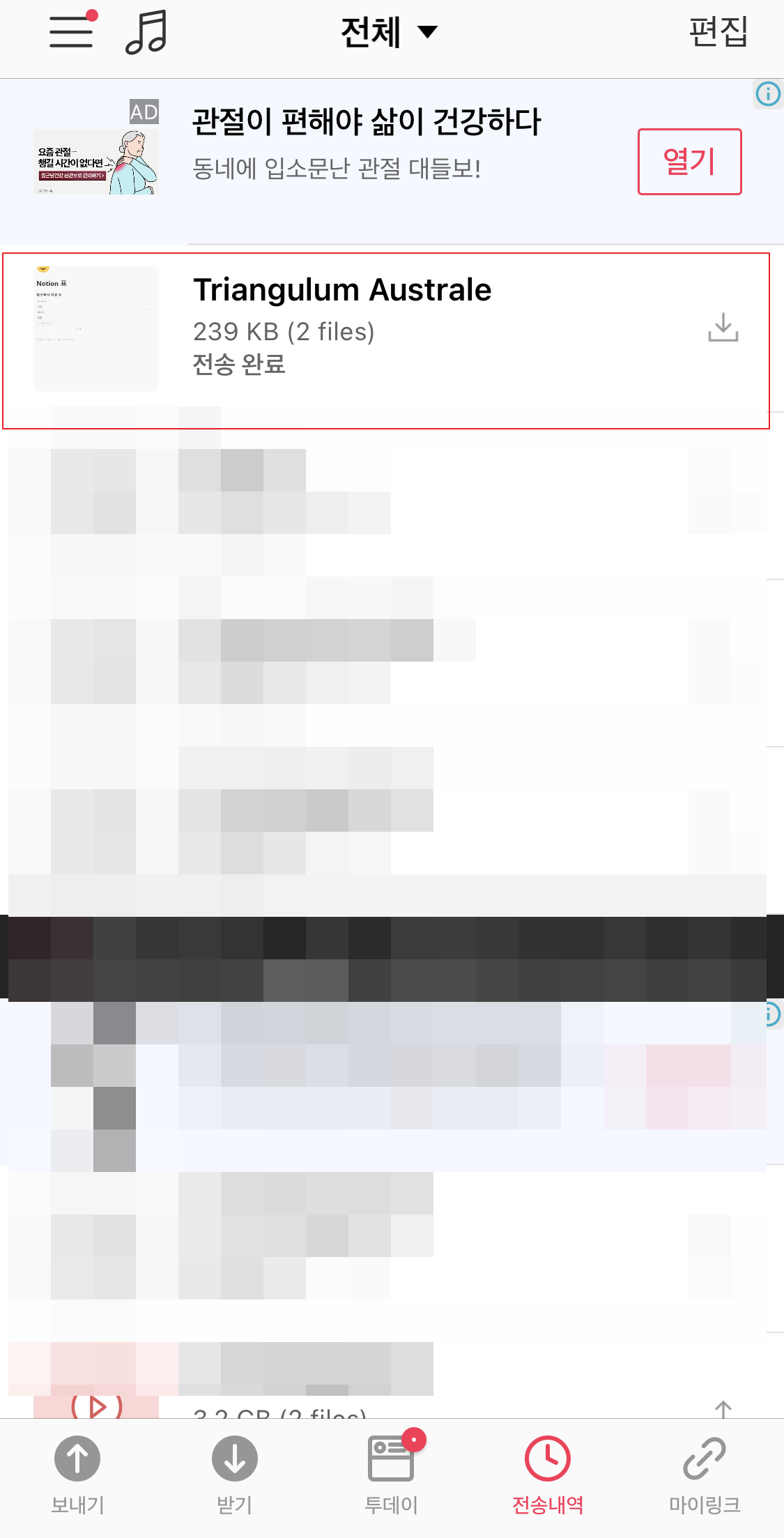 전송내역에 보면 PC에서 보냈던 파일 2개가 다운로드하여진 것을 볼 수 있다.
