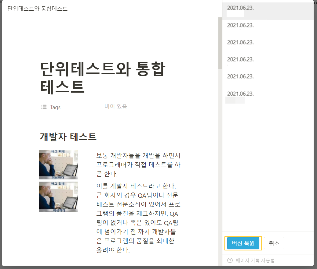 내가 원하는 페이지를 찾았다면 버전 복원 버튼을 통해서 바로 해당 내용으로 복원하는 것도 가능하다.👍