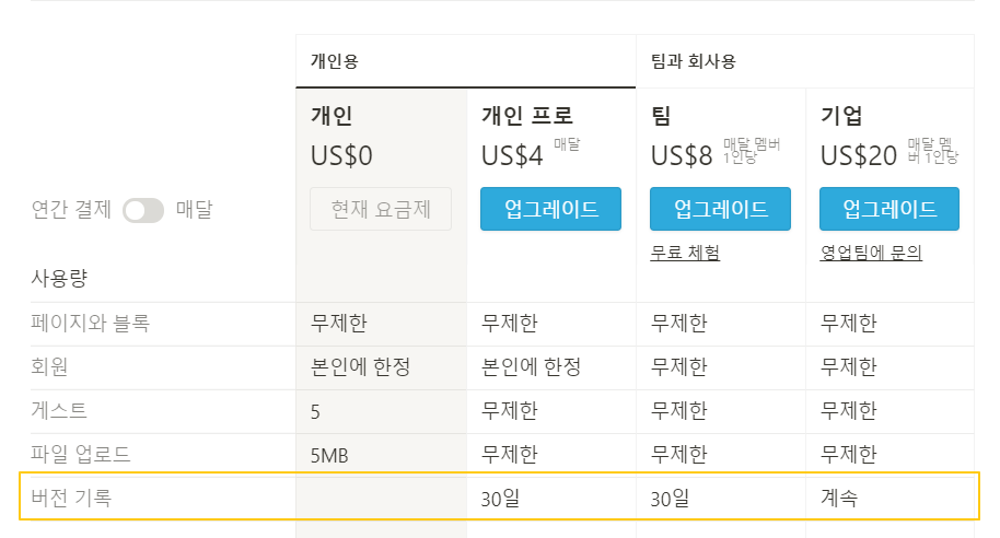 노션에서 버전기록을 이용하려면 아쉽지만, 무료요금제에서는 제공이 되지 않는다.