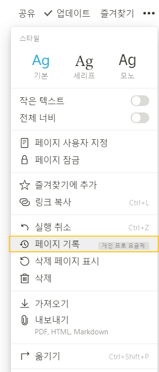 노션 왼쪽 상단의 점세개를 누르면 페이지 기록이라는 기능이 있다.