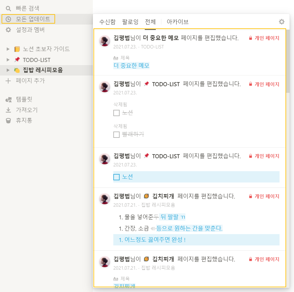 노션 사이드바의 모든 업데이트 > 전체 메뉴에 들어가 보면 내가 페이지를 수정했을 때