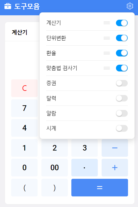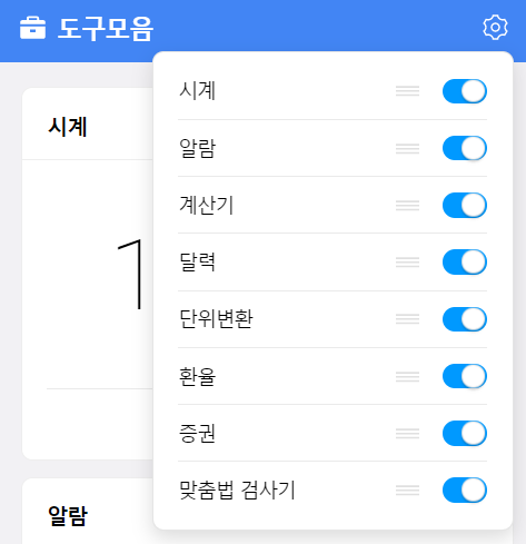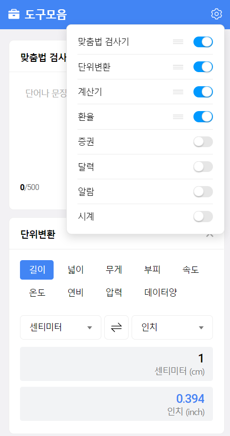 나의 경우 가장 자주 쓰는 맞춤법 검사기와 단위변환을 맨 위로 올려놓고 사용한다.
