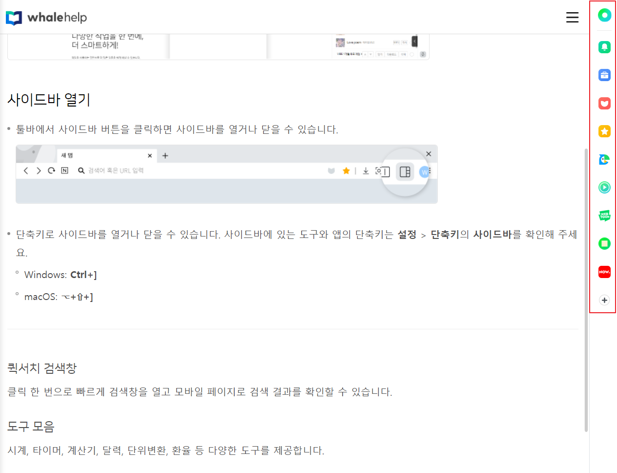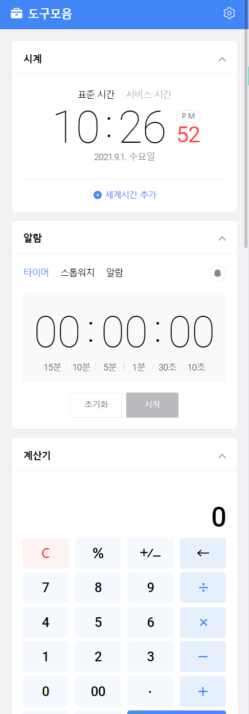 사이드 바 도구 모음에는 시계, 알람, 계산기, 달력, 단위변환, 환율, 증권, 맞춤법 검사기 총 8가지 기능이 제공된다.