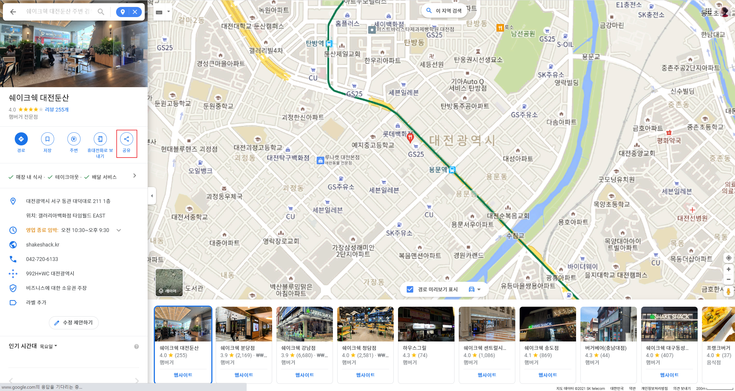내가 원하는 장소를 선택하게 되면 구글 지도에서는 해당 장소에 대한 상세한 정보창이 뜨는데