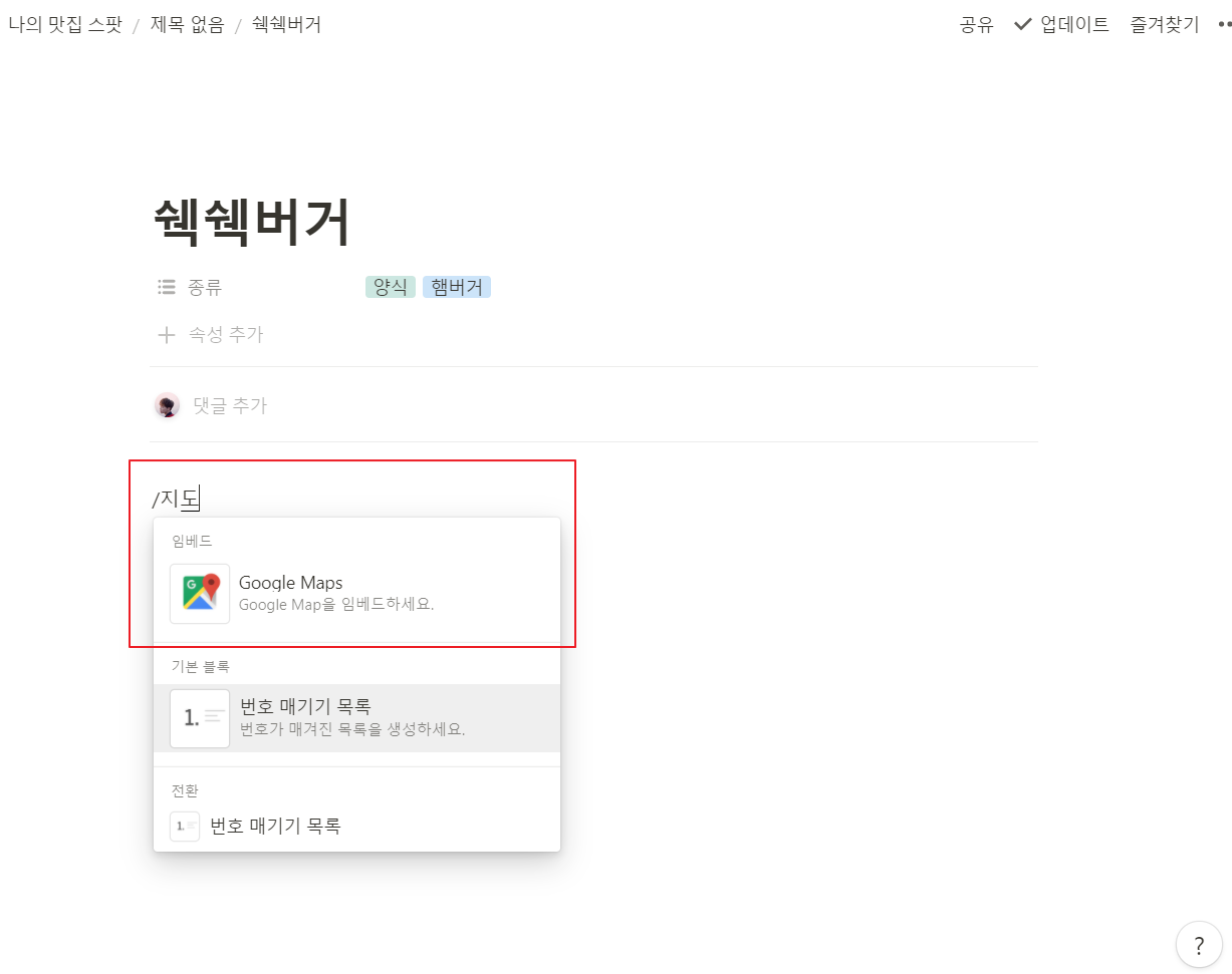 /지도 혹은 /googleMaps를 입력하면 임베드 메뉴 중 구글 지도 메뉴가 보이게 되는데