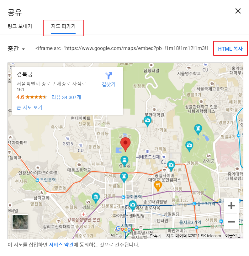해당 메뉴에서 지도 퍼가기를 누르면