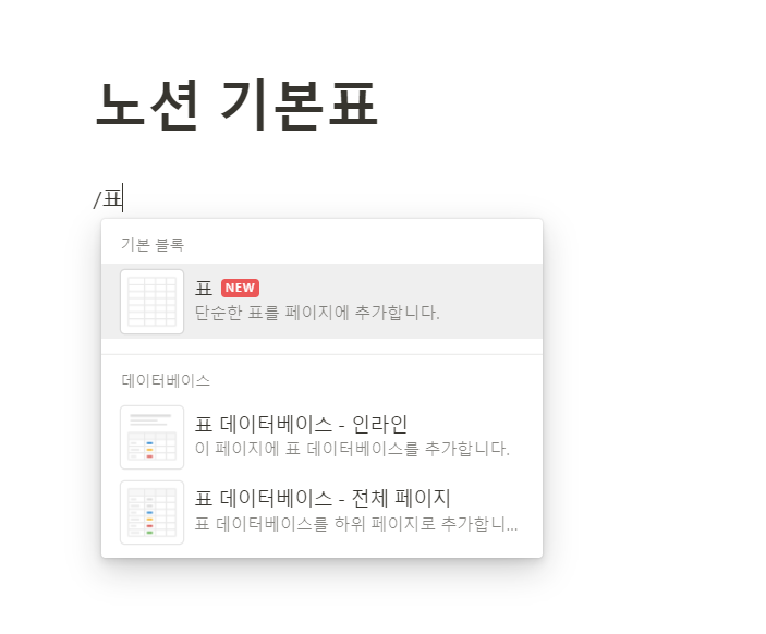 노션에서 추가된 간단한표는 데이터베이스 같은 화려한 기능이 아니라