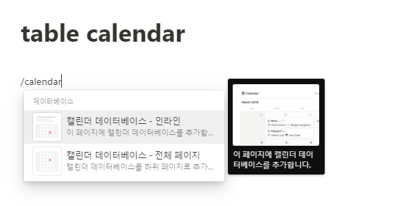 노션에서 /캘린더 혹은 /calendar로 영어로 검색하면