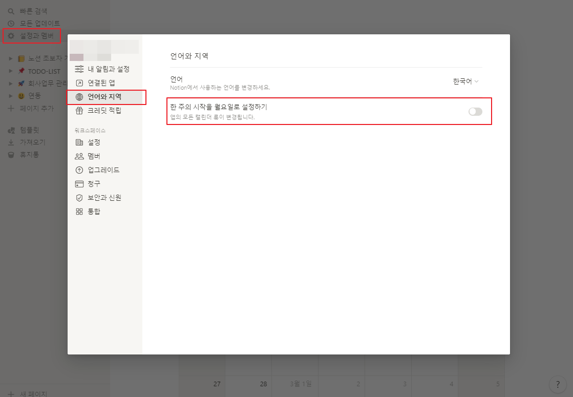 🤔노션 달력(캘린더) 시작 요일 변경하는 방법