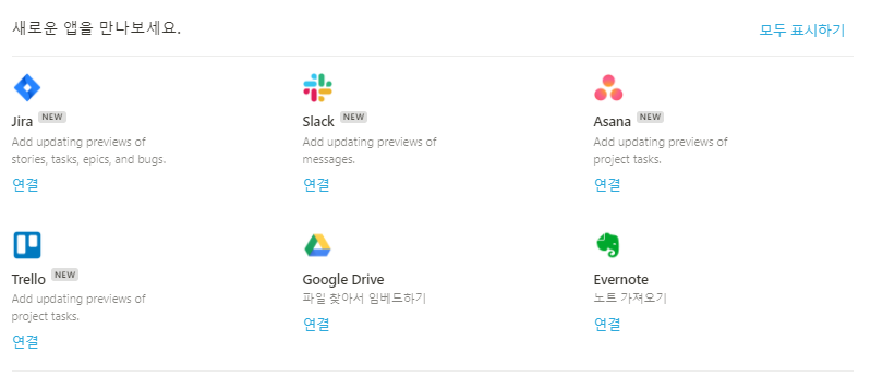 Notion에 연동이 가능한 앱은 github 외에도 Jira, slack, Asana, Trello, gogleDrive, Evernote 등이 가능하다.