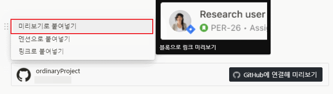 github 주소를 붙여 넣으면 Github에 연결해서 미리보기라는 문구가 추가되는데,