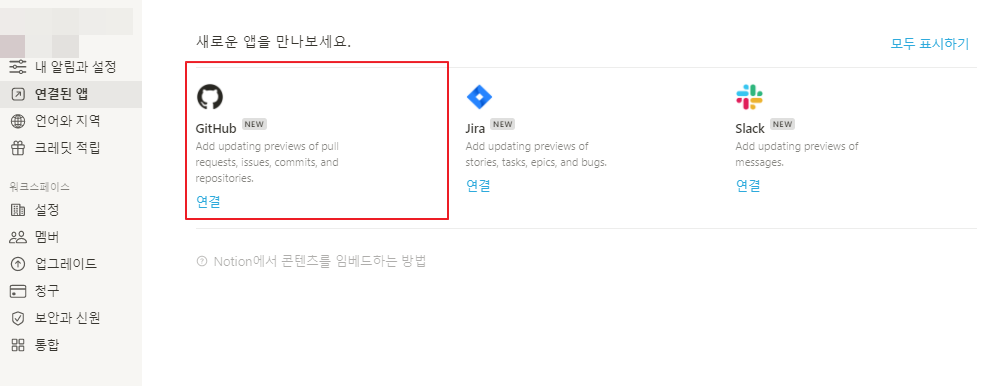Notion에서 연결된 앱이라는 탭에 들어가면 Github계정을 연동할 수 있는 기능이 있다.