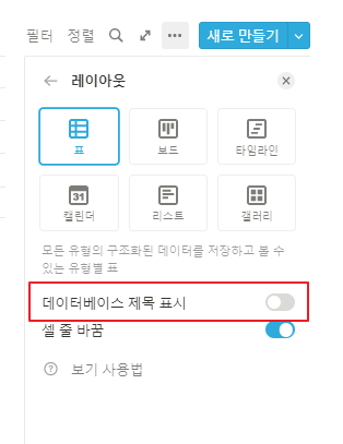 데이터베이스 우측 상단 점 3개를 클릭해서 레이아웃에서 데이터베이스 제목 표시를 클릭해주면