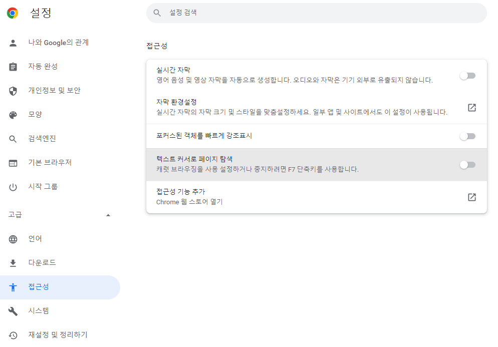 일단 크롬 브라우저에서 설정 > 접근성 메뉴에 들어가면