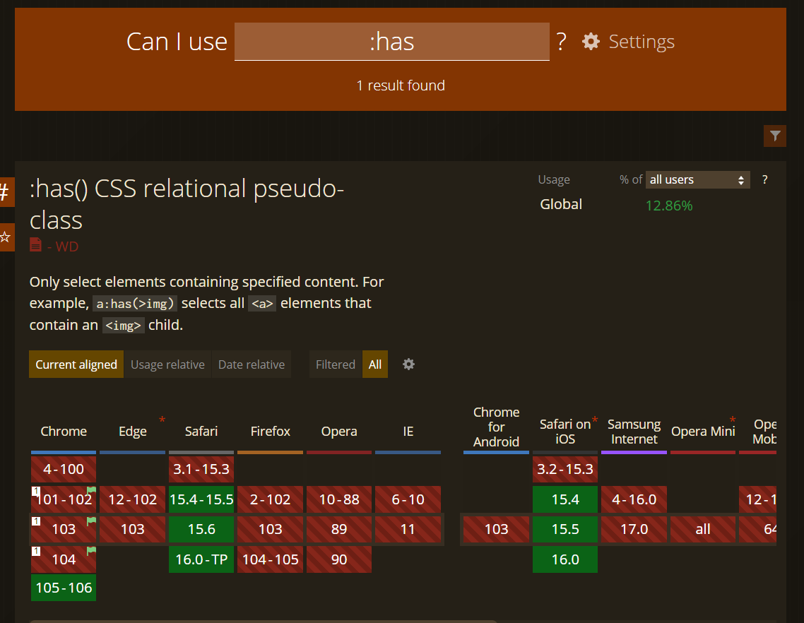 내가 딱 원하는 기능이었으나, 아쉽게도 아직 :has는 대부분 브라우저에서 지원이 되지 않는다.