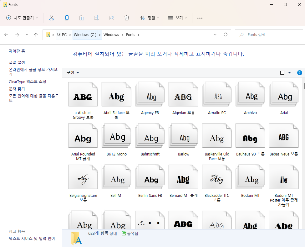 내가 설치한 폰트는 C드라이브에 windows/fonts 폴더에 들어가면 확인할 수 있다.