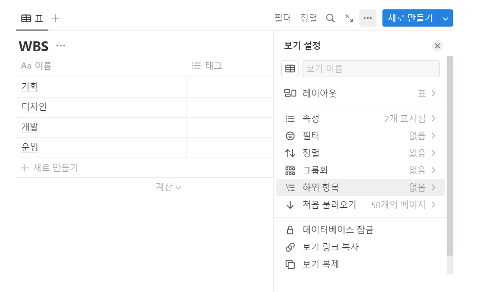 하위 속성을 이용해서 만들어본 간단한 WBS 표이다.