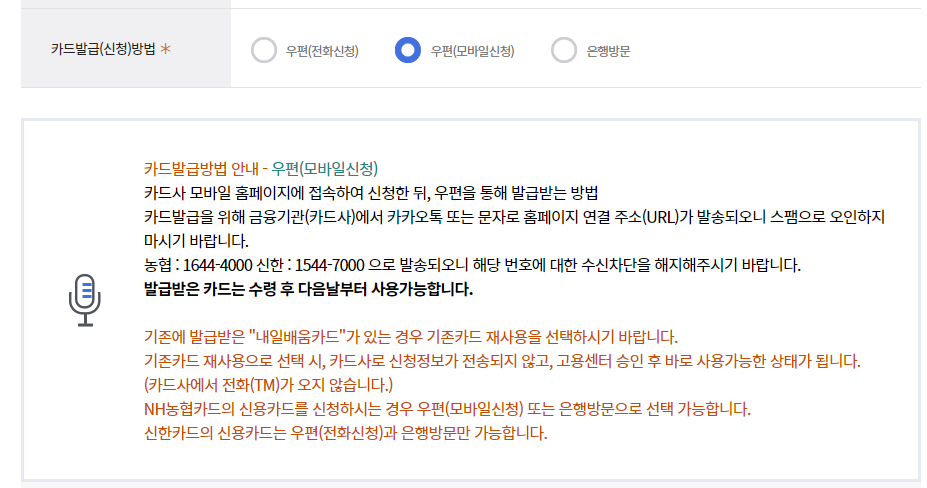 우편으로 신청시 모바일 신청을 하면, 카드 발급을 위한 URL이 내 핸드폰으로 발송된다고 한다.