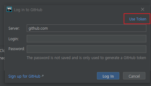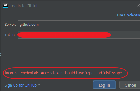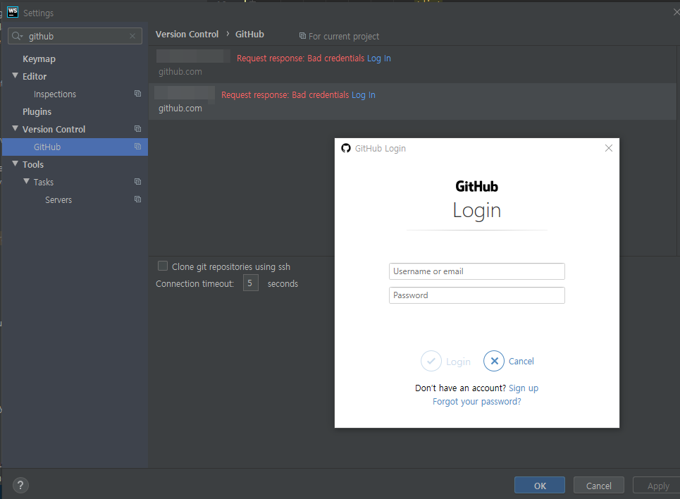 연결이 끊긴 상태가 되면 webstrom 자체에서 로그인을 하라는 창이 생성되는데,