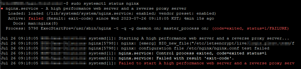 Active: failed 상태로 현재 우분투 서버 내 ngnix가 오류가 난 상태임을 확인했다.