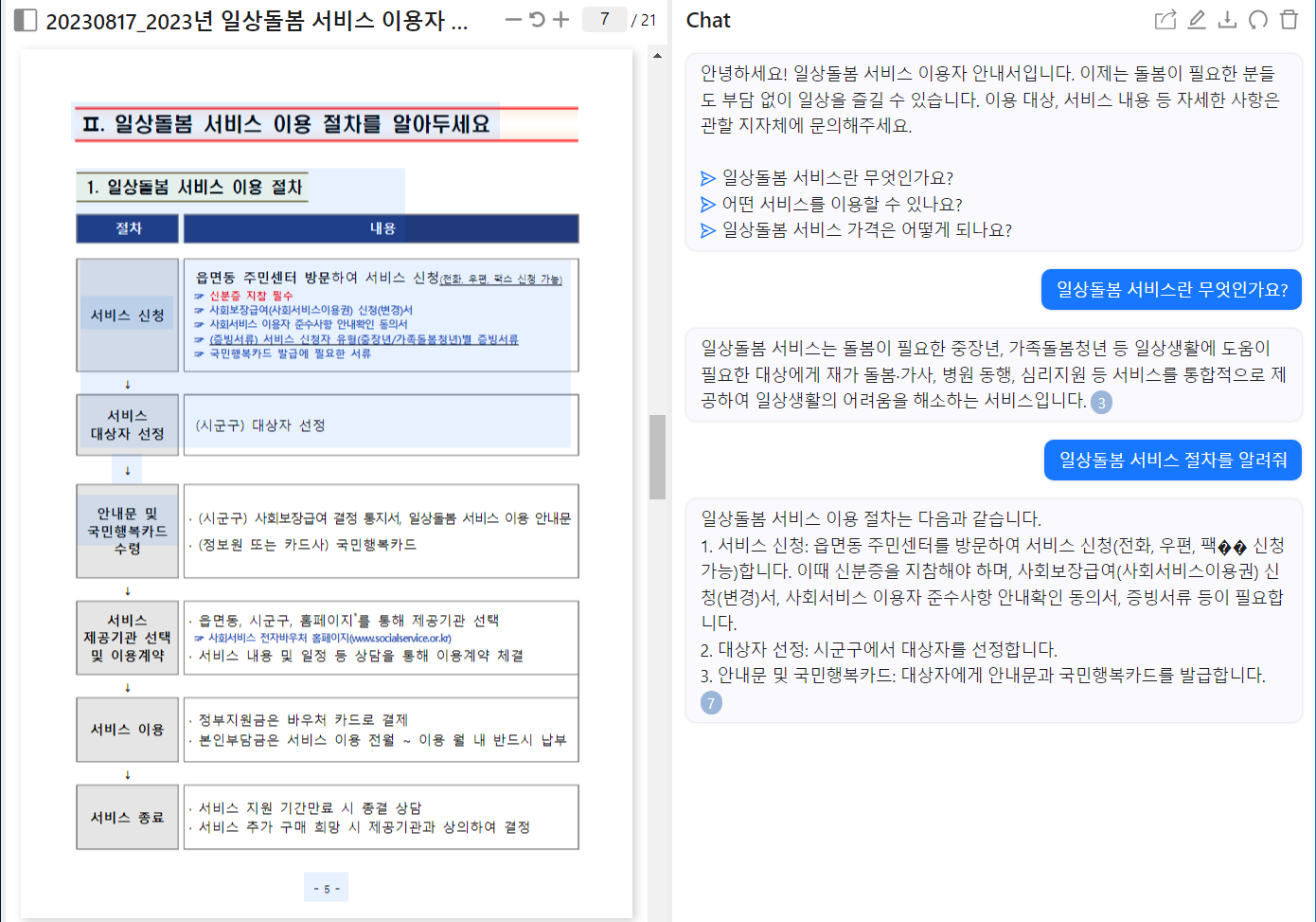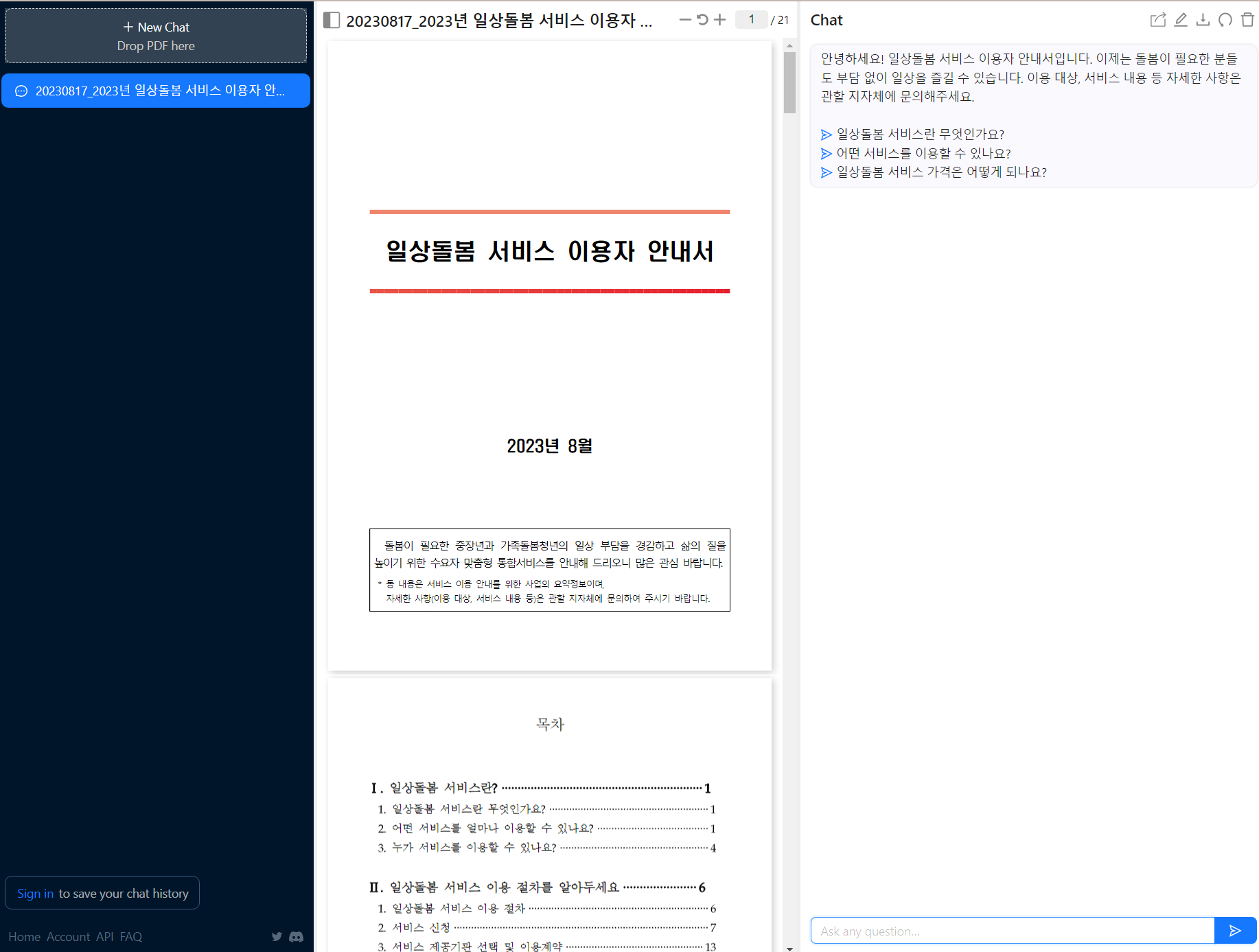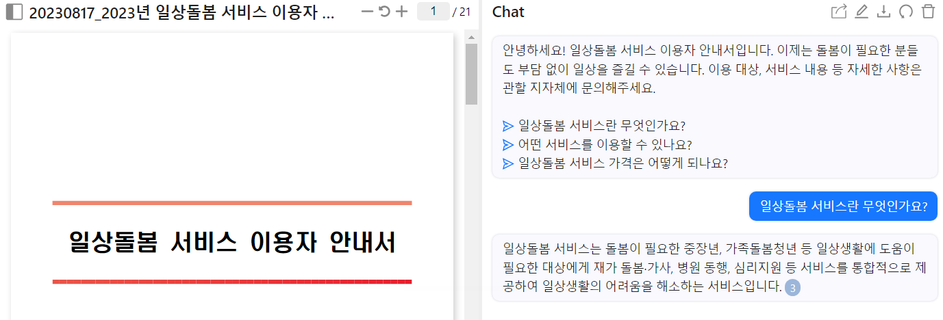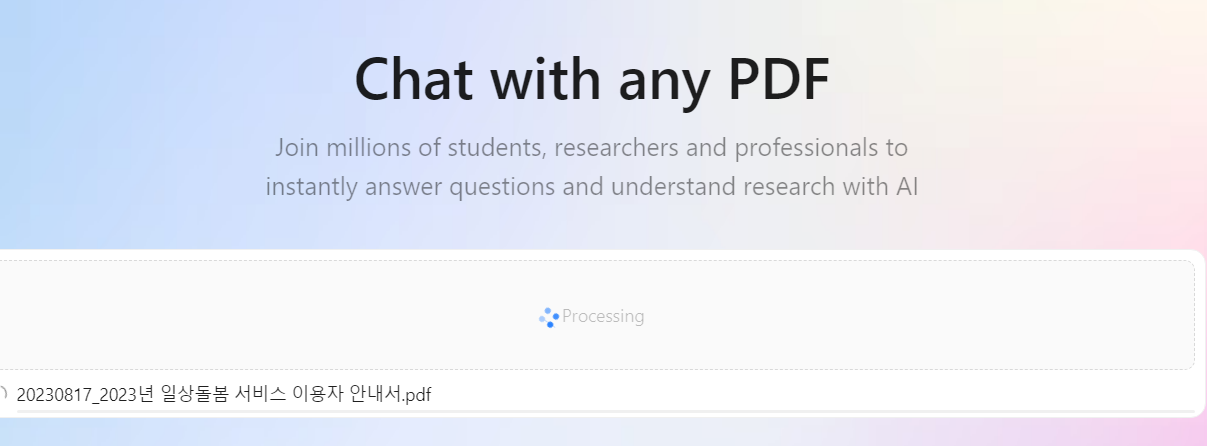 업로드가 완료되면 왼쪽에 채팅형식으로 해당 PDF를 정리해서 보여주는 것을 볼 수 있다.