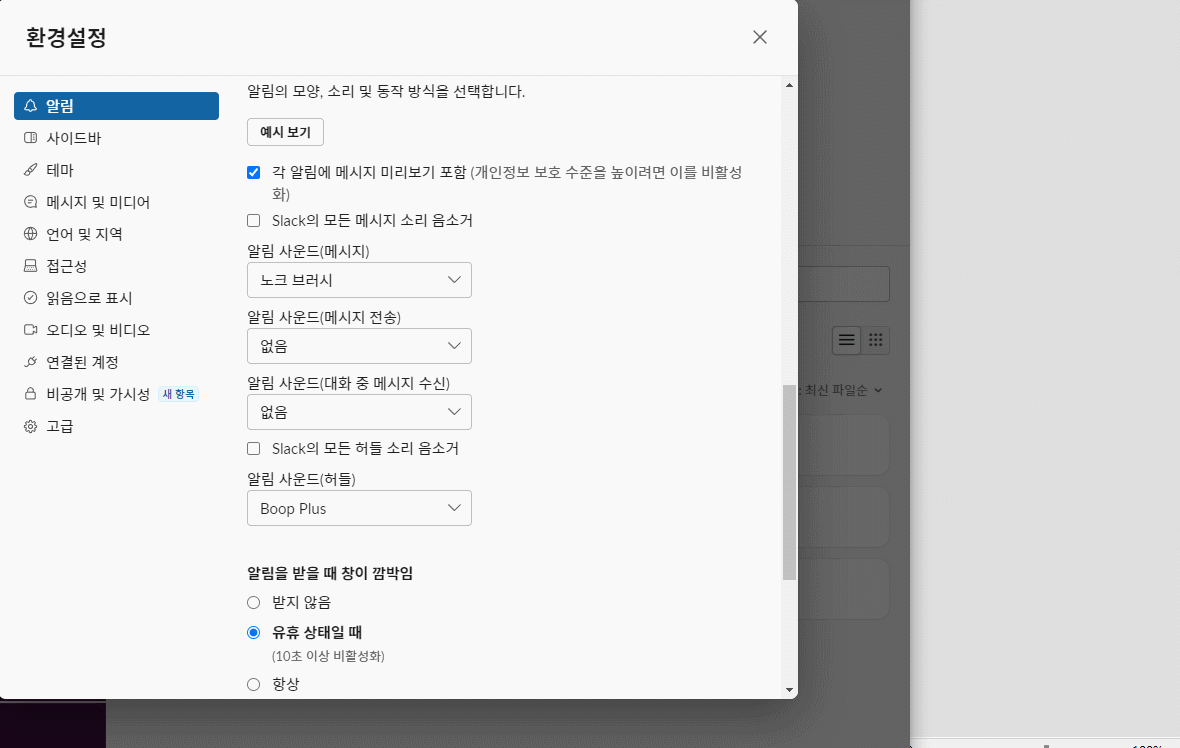 슬랙에서 알람이 안뜨는 경우, 환경설정 알림을 확인해주자