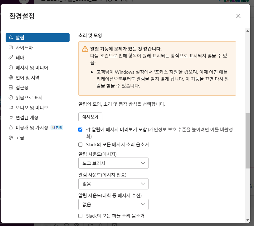 집중지원 해제 후, 환경설정 > 알람> 예시보기를 클릭하니