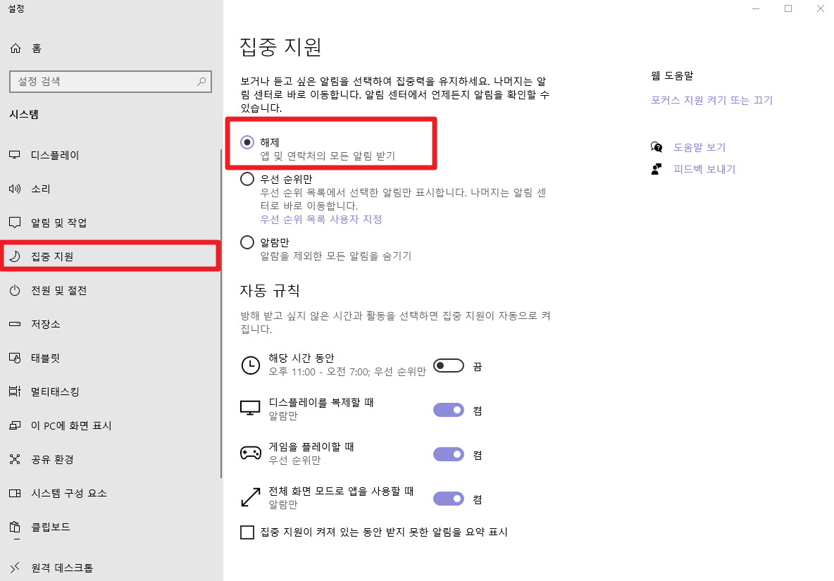 😎집중 지원 > 해제