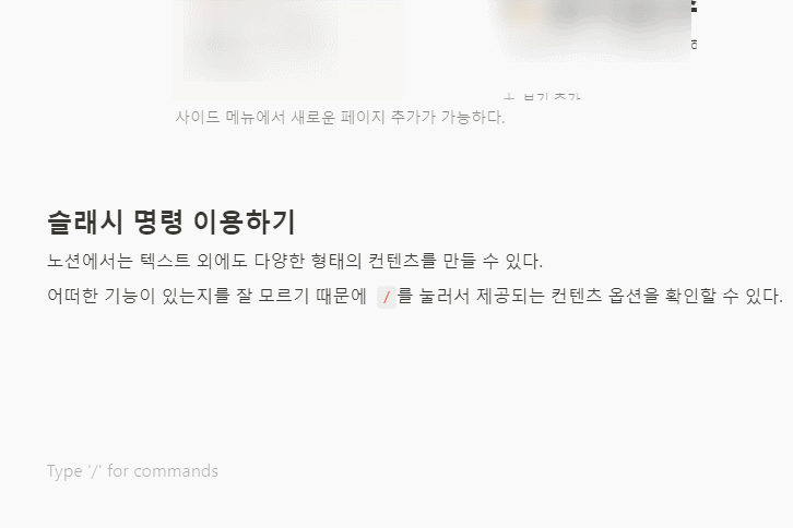 노션에서는 텍스트 외에도 다양한 형태의 콘텐츠를 만들 수 있다.