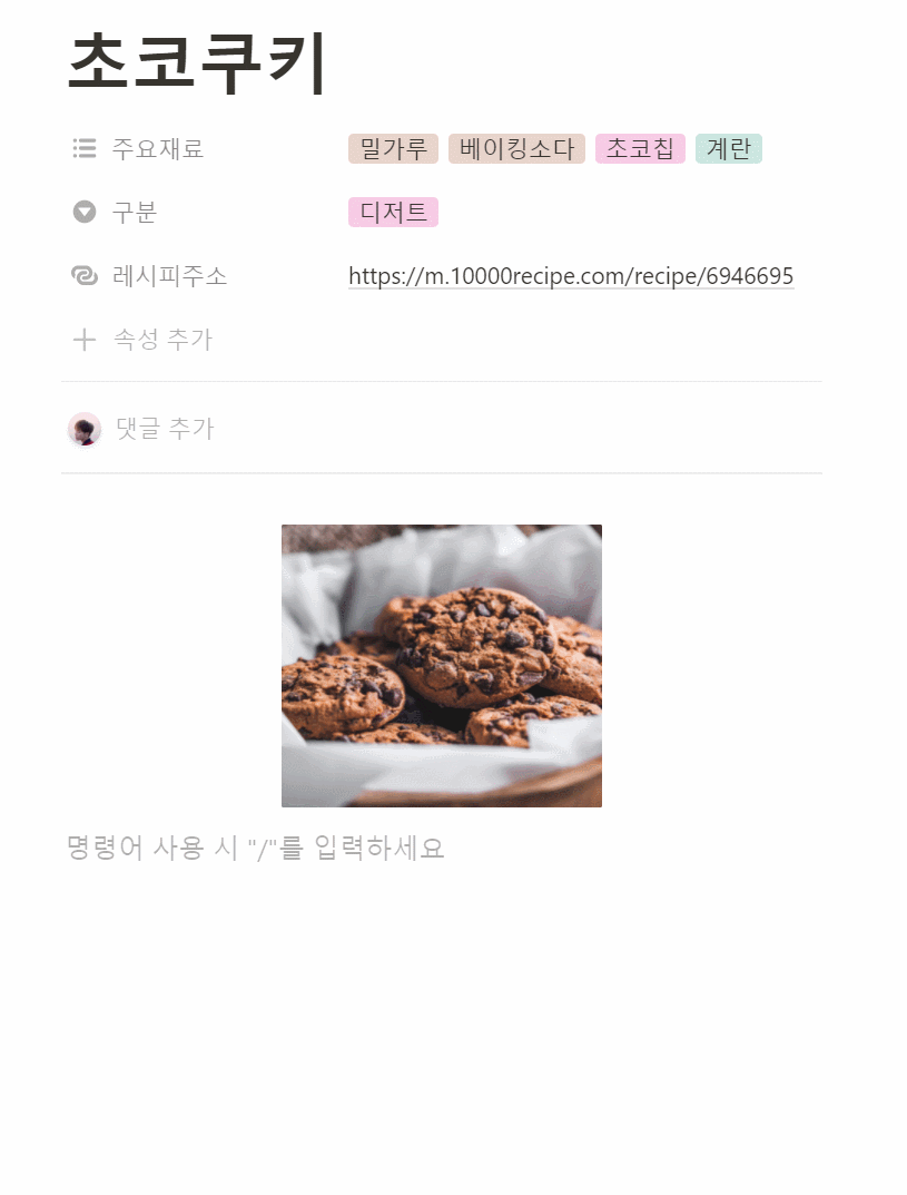 임베드에 내가 보고 싶은 레시피 링크를 복사해서 넣으면 노션 내에서 해당 페이지의 레시피를 볼 수 있다.