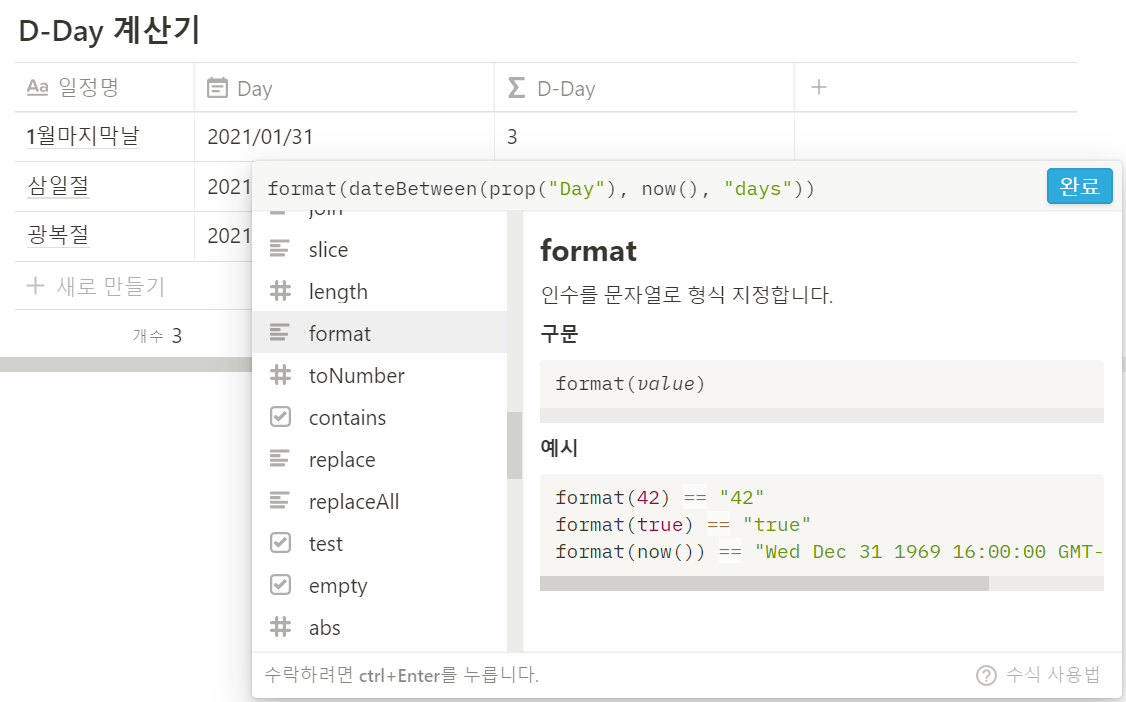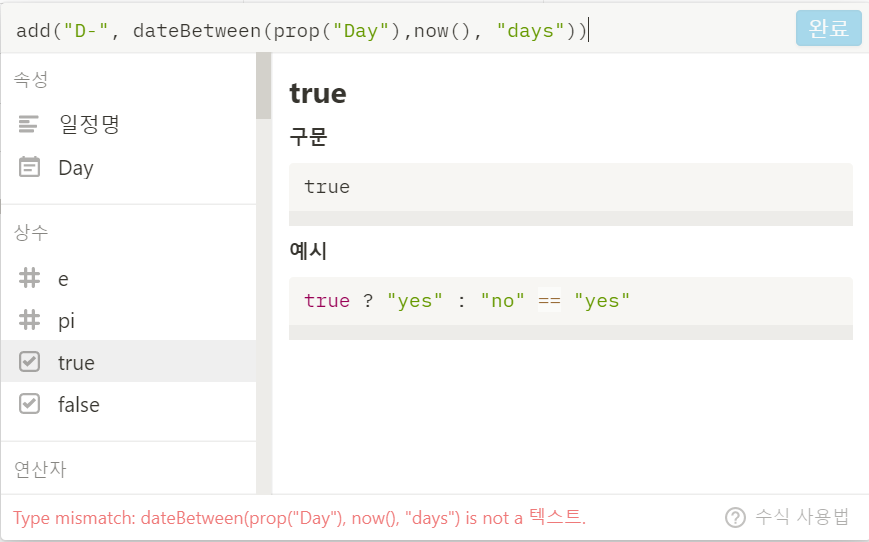 add("D-", dateBetween(prop("Day"), now(), "days")) 와 같은 코드를 입력했을 경우,