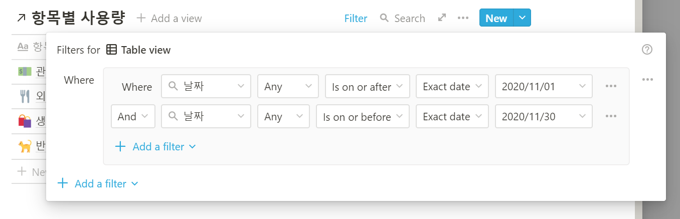 월 별 페이지를 만들어 해당 페이지에서 필터 기능을 월 별 지출 내용만 볼 수 있는 표를 만들었다.