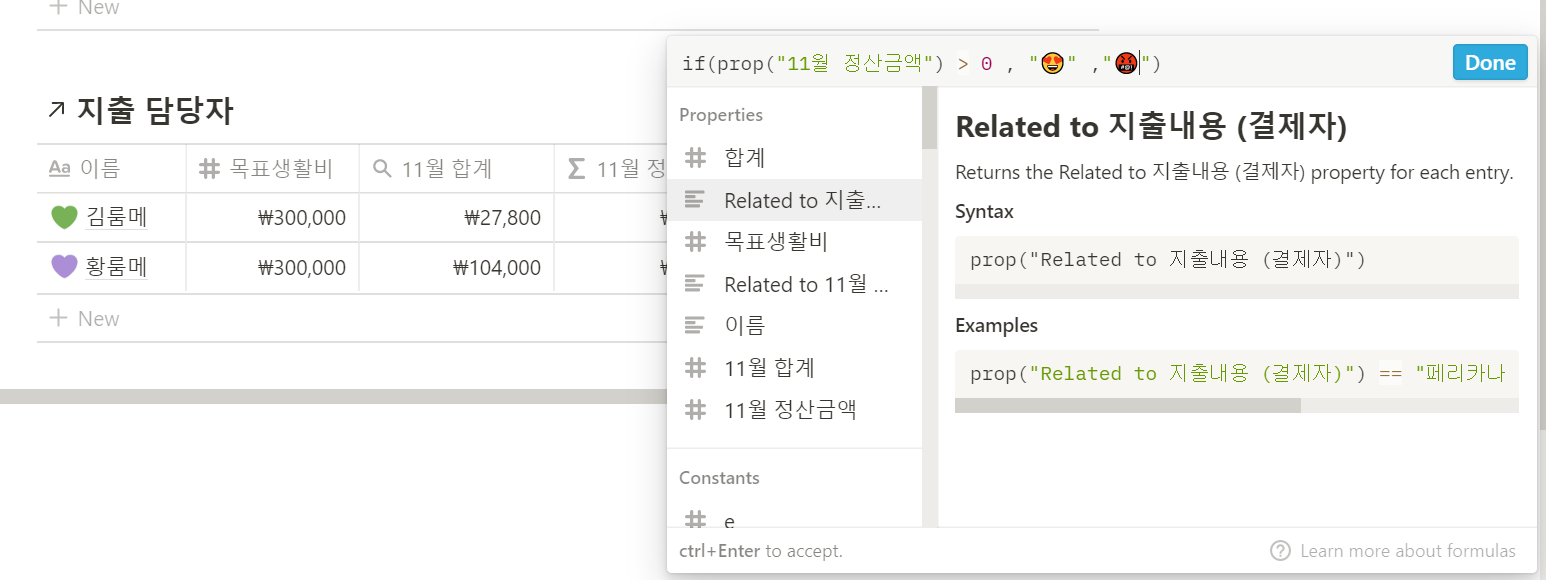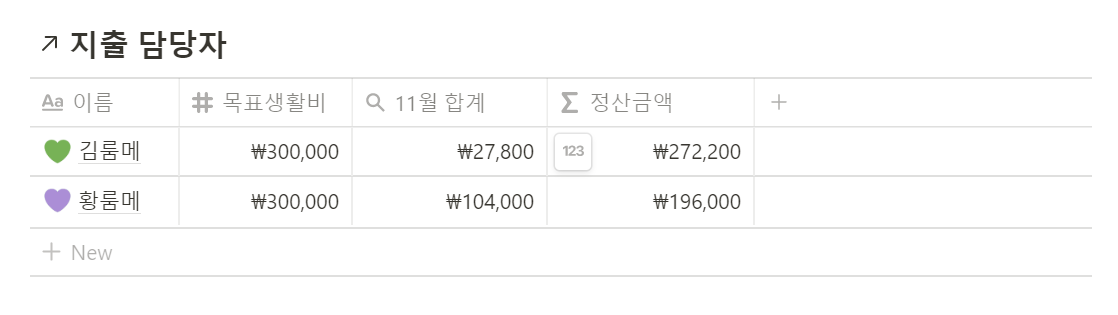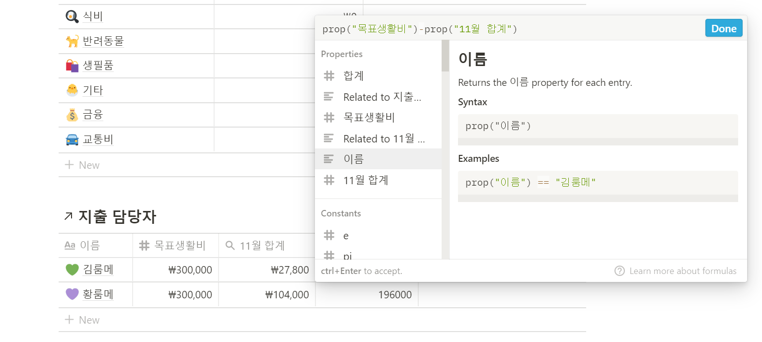 월별 페이지 내 지출담당자 표에 formula 필드를 추가한다.