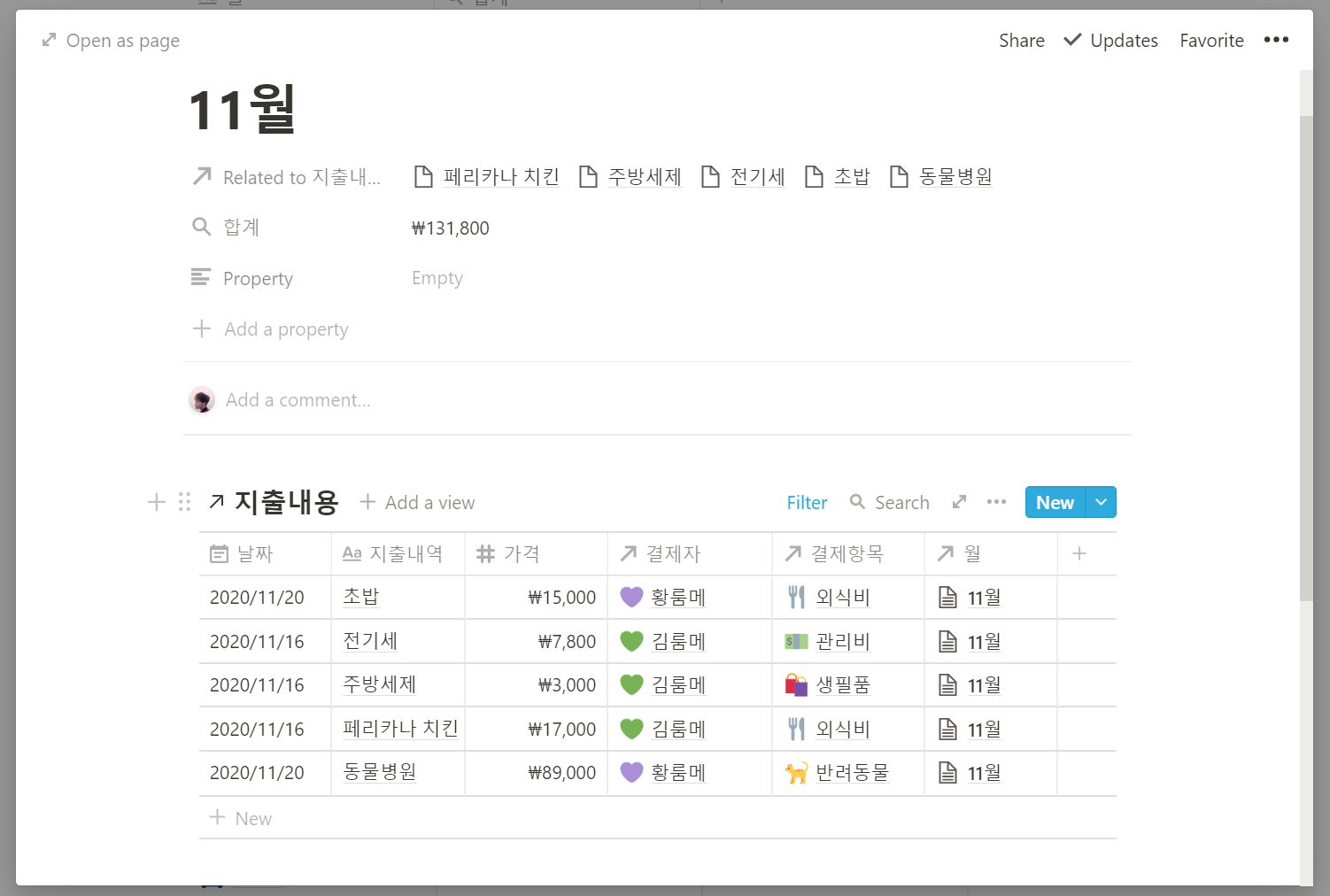 Notion 날짜 필터와 linkted database를 이용한 월별 확인 가계부 만들기 전편에서 룸메와 함께 쓸 가계부의 기능에 대해 정의한 뒤. 지출내역을 입력하면, 자동으로 지출 항목 별, 지출한 사람별로 합