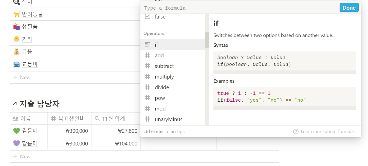 이렇게 formula를 이용해서 룸메가 각자 목표 생활비를 넘지 않고 사용하고 있는지를 확인할 수 있다.