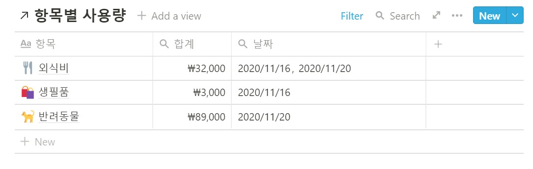 지출 내용 표와 Relation으로 연결된 항목별 사용량 표를 Create linked database를 이용해서 가져왔을 때