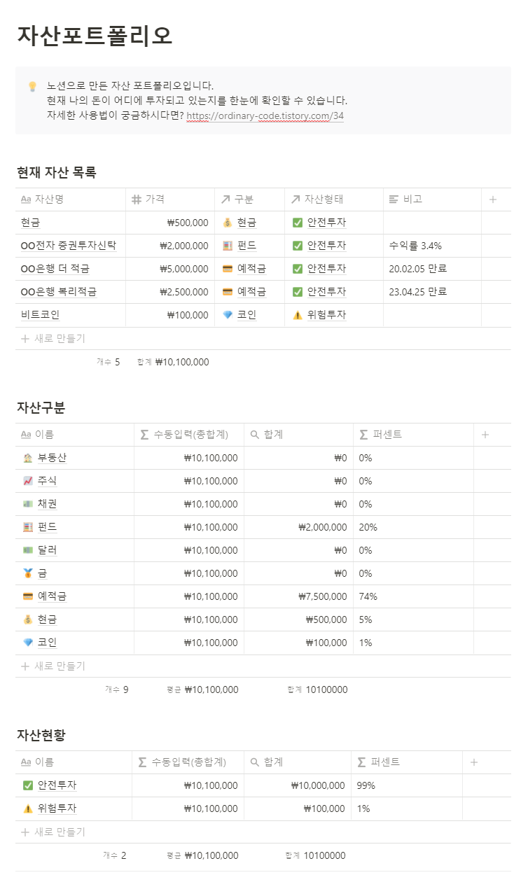 노션으로 만든 자산 포트폴리오입니다. 현재 나의 돈이 어디에 투자되고 있는지를 한눈에 확인할 수 있습니다. 자세한 사용법이 궁금하시다면? https://ordinary-code.tistory.com/34