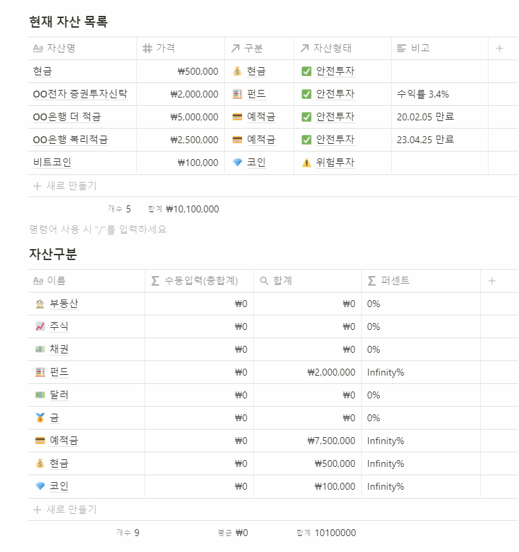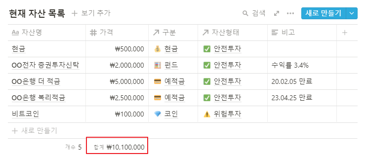 자신의 자산을 확인하는 게 중요하다고 하길래 이번 기회에 노션으로 정리해보기로 했다.