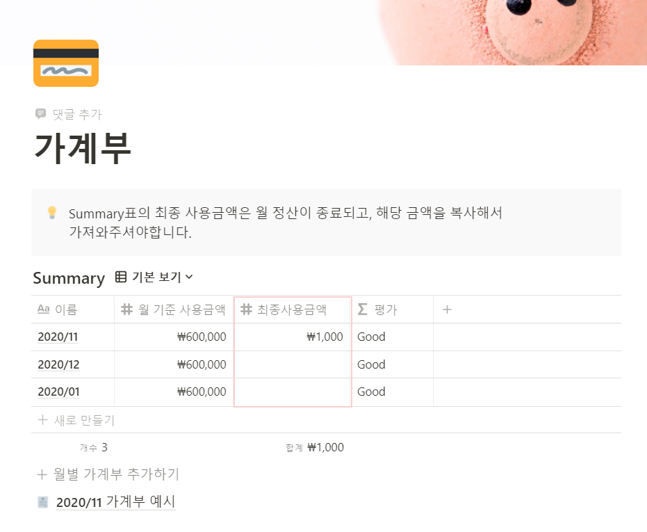 월별 가계부 추가하기 버튼을 클릭 시 추가되는 예시는 원하는 양식으로 변경할 수 있다.
