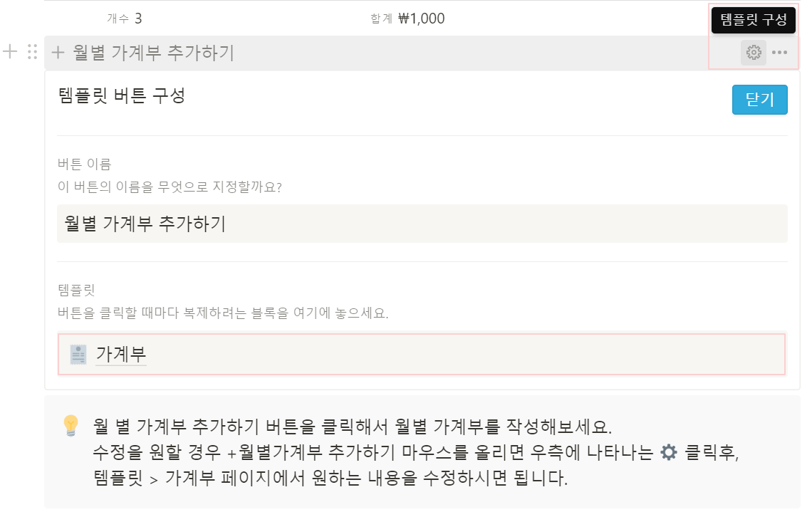 월별 가계부 추가하기 블럭에 마우스를 올리면 우측에 템플릿 구성 버튼이 나타난다.