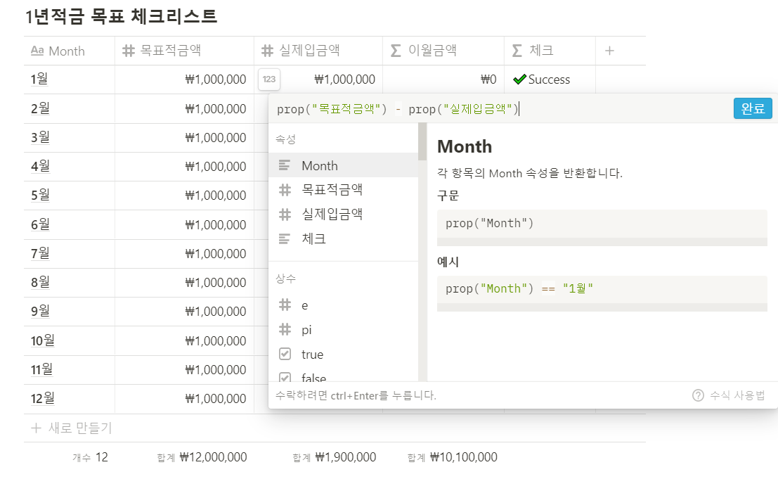 노션에서 수식 셀을 이용하면 특정 계산이 가능하다.