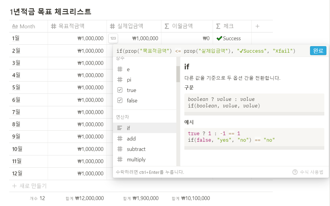 노션에서 if문 사용방법은 아래와 같다.