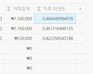 위의 숫자 형태에서 노션 자체적인 % 기능을 이용하 경우 나타난 소수점이 없어진 것을 확인할 수 있다.
