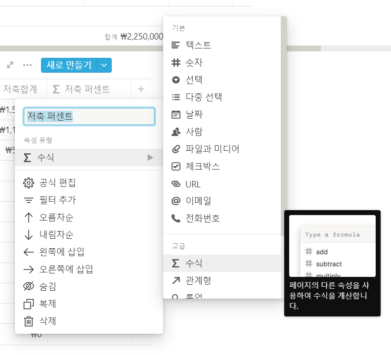 먼저 노션에서 퍼센트를 계산하기 위해서는 표 속성을 수식으로 변경한 뒤 계산을 해줘야 한다.