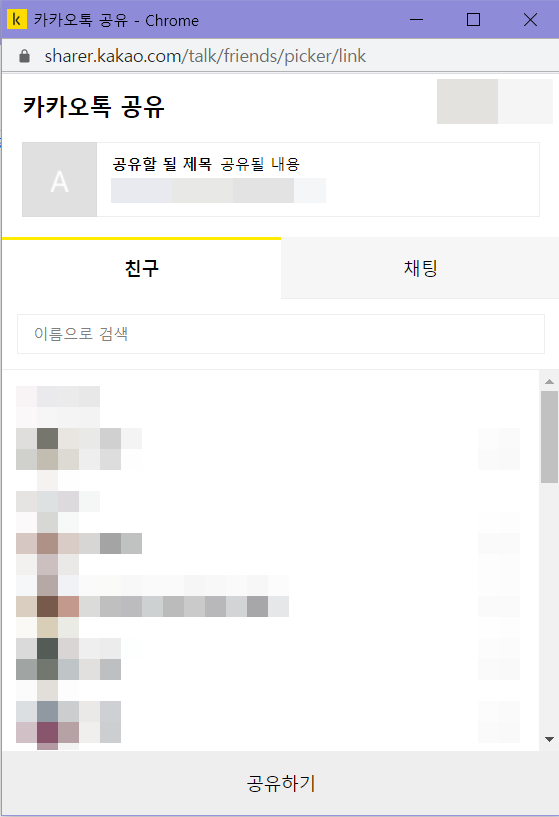 카카오톡 URL 공유하기 팝업창을 뜨는 것을 확인할 수 있다.