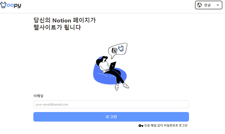 Oopy(우피) 는 여러분의 노션 페이지를 성능 좋은 웹사이트로 바꿔주는 서비스입니다. 원하는 주소를 연결하여 블로그, 포트폴리오 그리고 홈페이지(소개, 가이드, 채용)로 사용해 보세요.