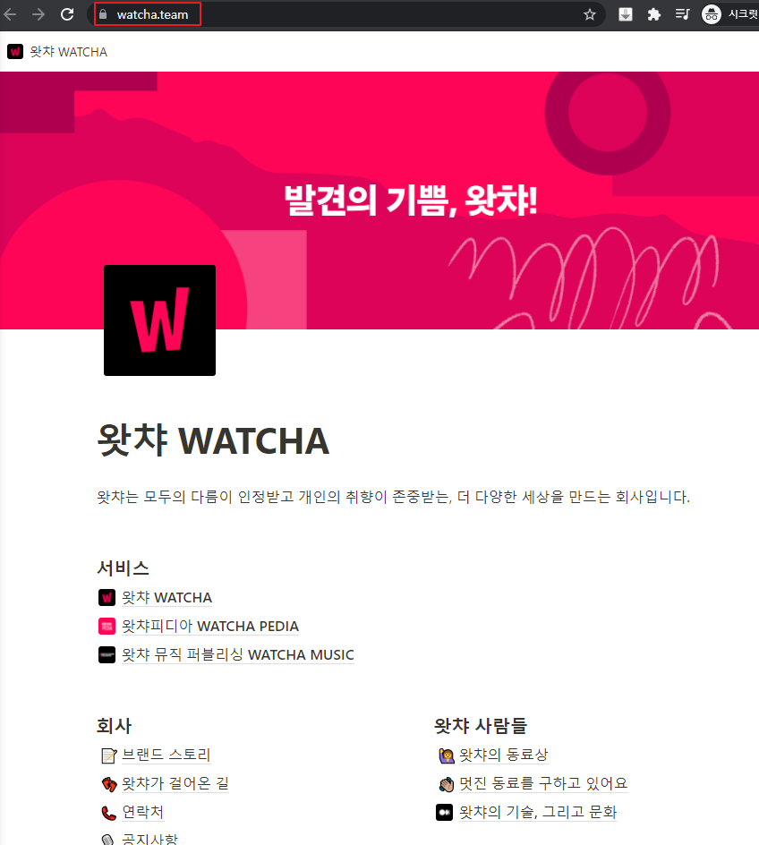 노션의 디자인을 그대로 가져왔지만, URL은 왓챠 고유의 URL이 사용되고 있다.