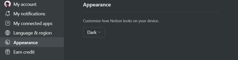 모든 노션 페이지가 다크 모드로 설정되게 된다.