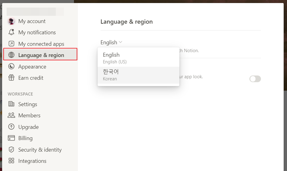 노션을 사용하다보면, 영어와 한국어 중 편리한 언어를 쓰는 것이 가능하다.